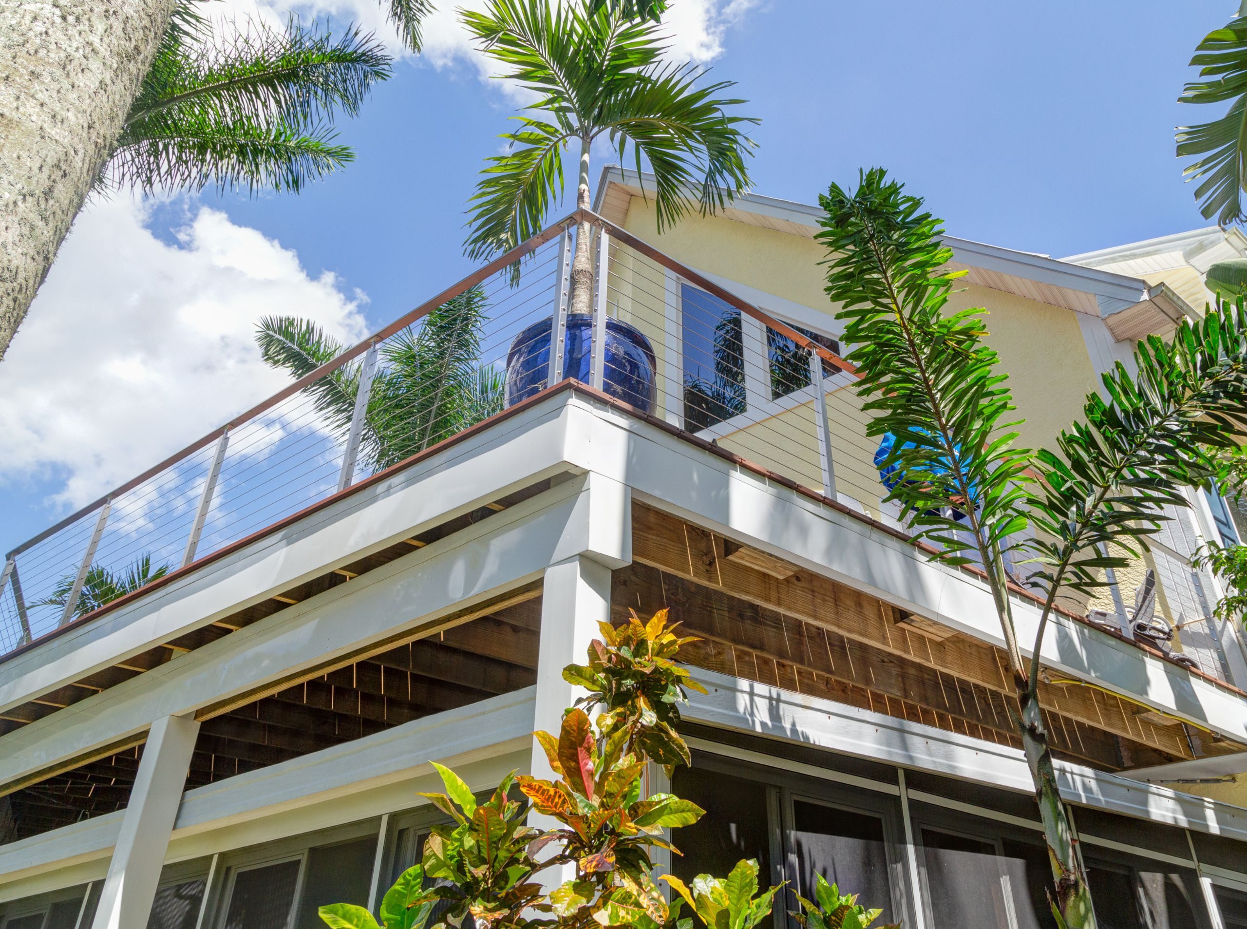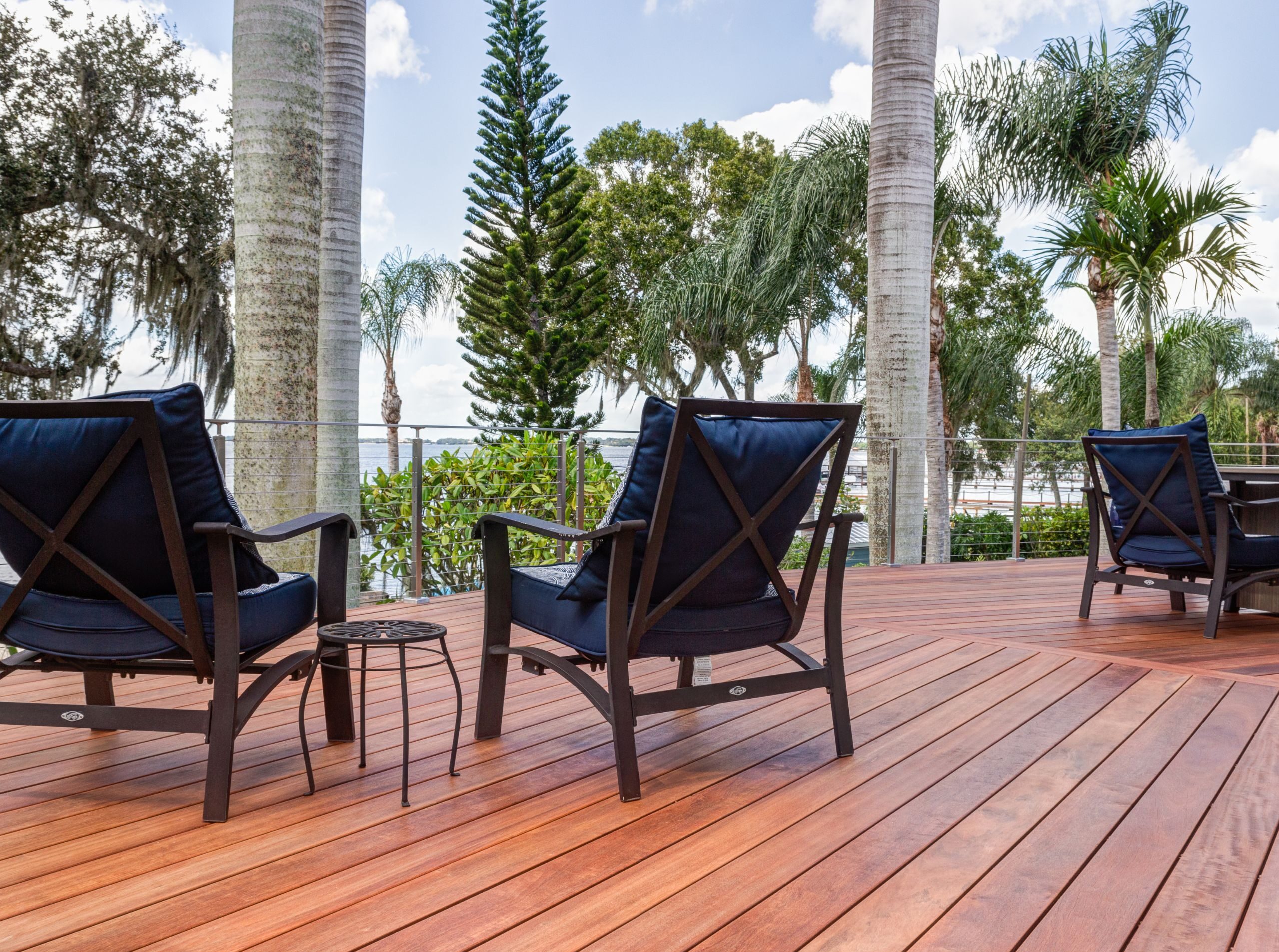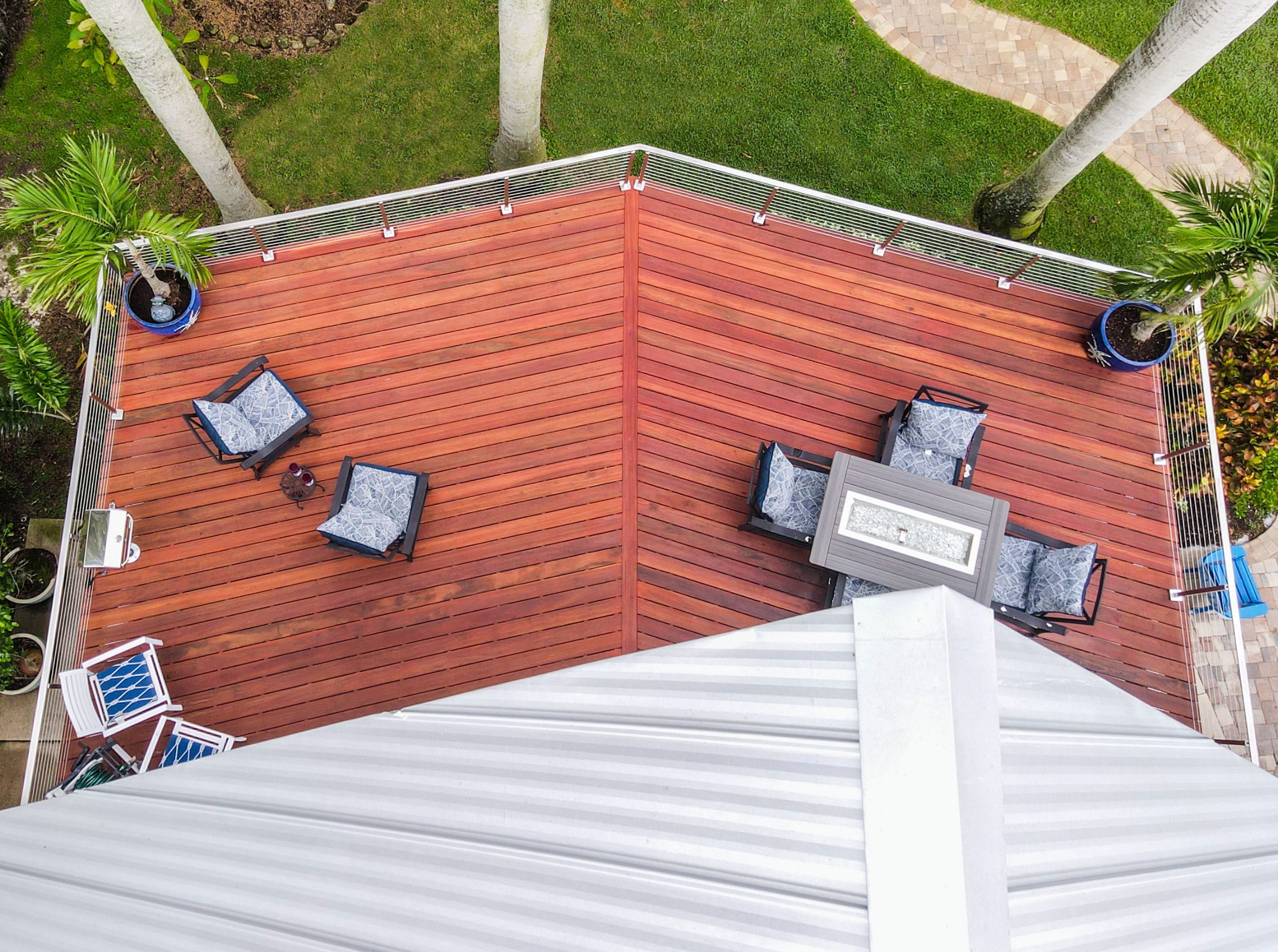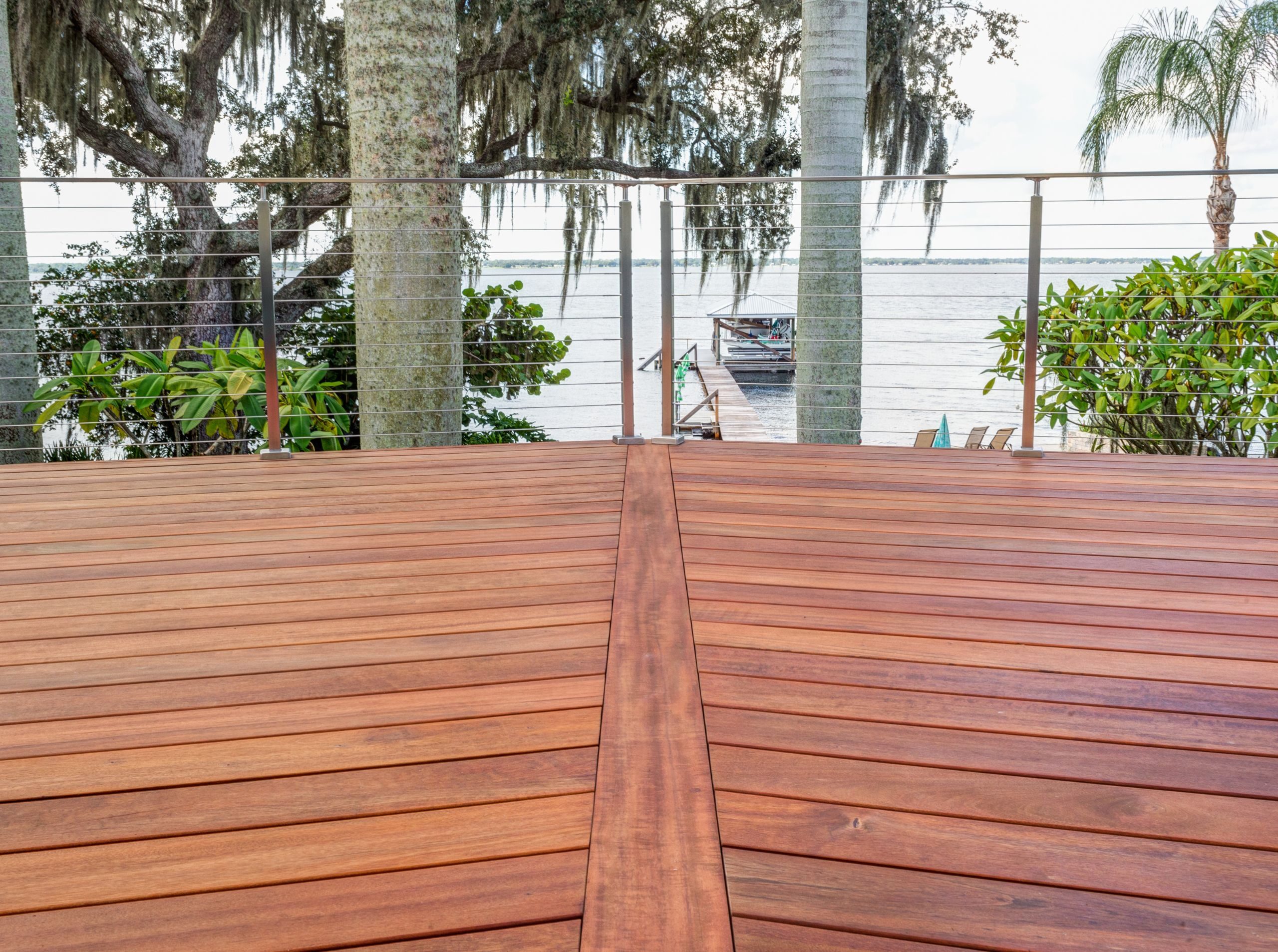 This deck originally featured gray boards with white composite railing but the homeowners wanted something warmer and more natural. We transitioned to Tigerwood, a richly colored hardwood known for its striking grain—and its density.