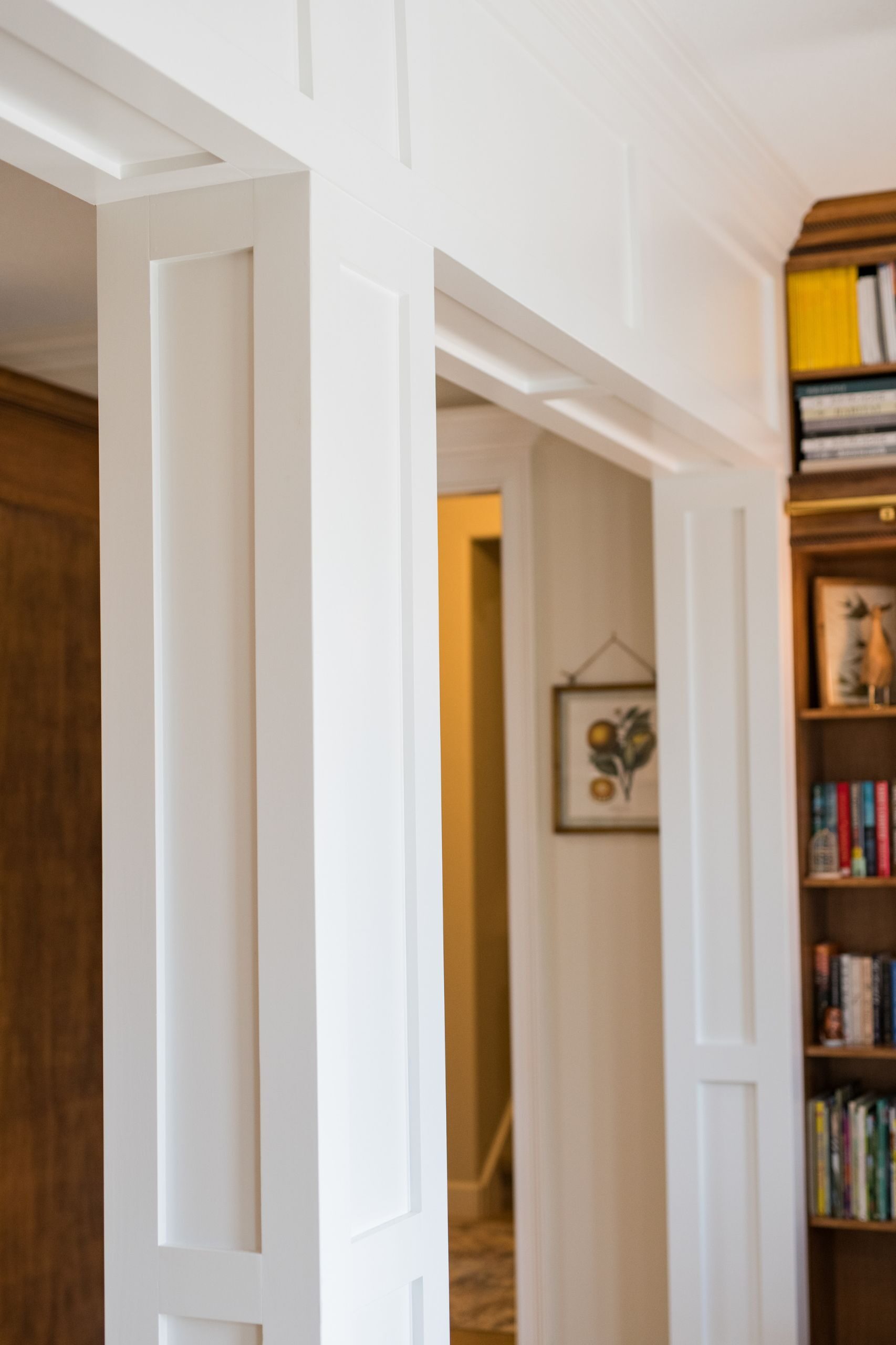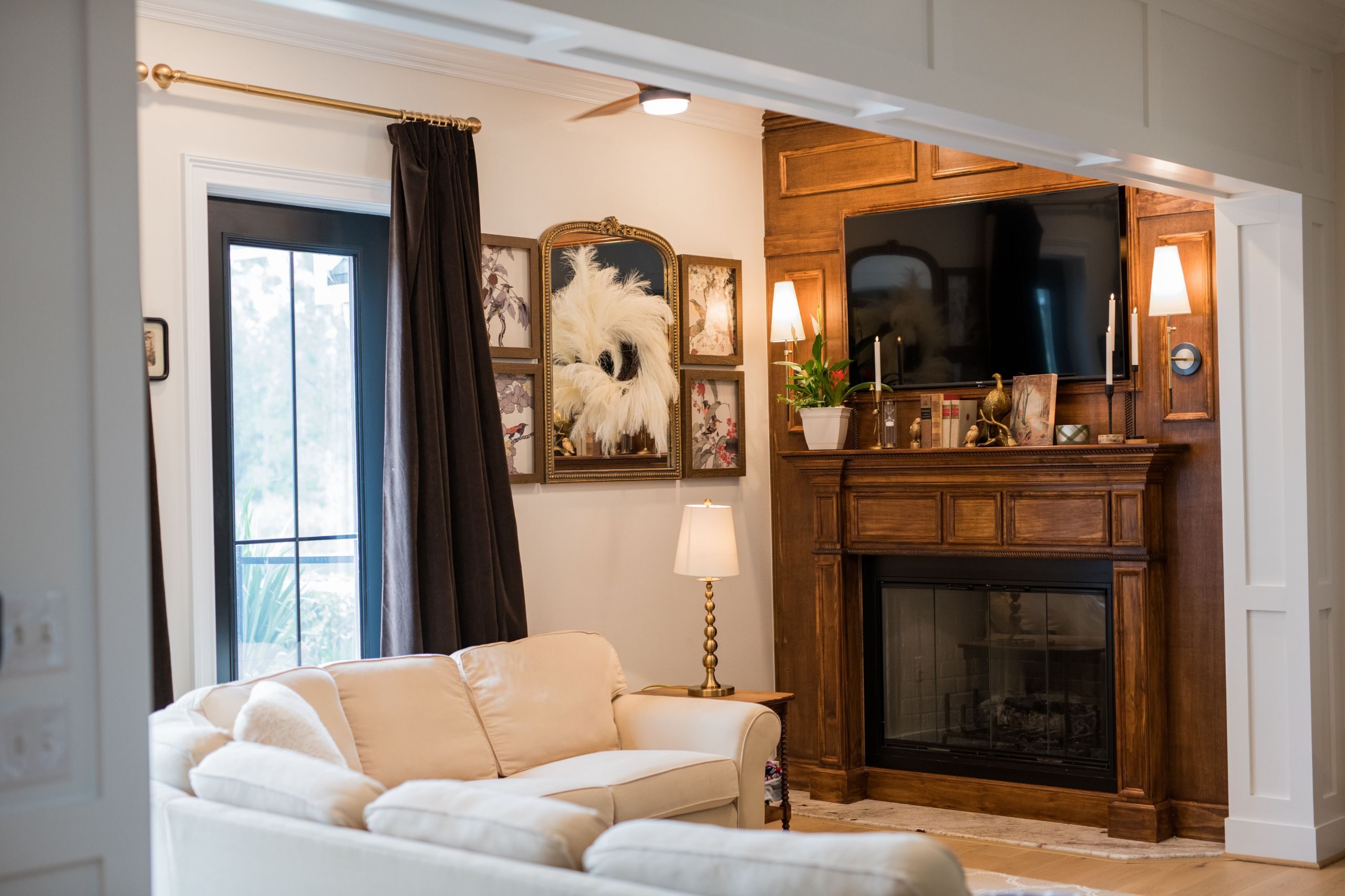 The design of this addition balances timeless character with everyday livability. Warm wood tones, cased openings in crisp white frame the entry, creating architectural definition and flow. Neutral furnishings and layered textures keep the space inviting, while black French doors provide contrast and natural light. The result is a style that feels both classic and current—comfortable, refined, and distinctly personal.