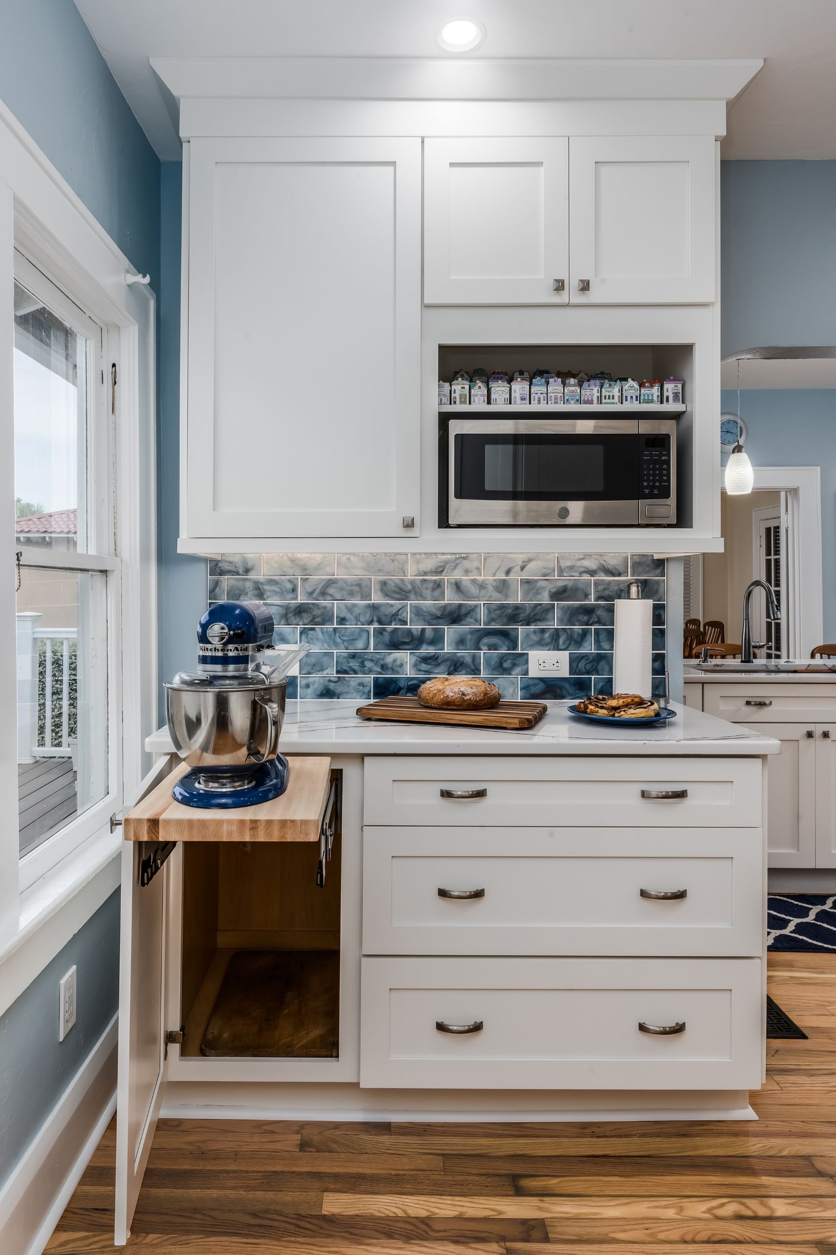 One of the homeowners’ top priorities was a dedicated baking station. We incorporated a built-in mixer stand lift, making it easy to access and store. Adjacent to it, ample cabinetry ensures every piece of bakeware has a place, creating an organized and efficient workspace.